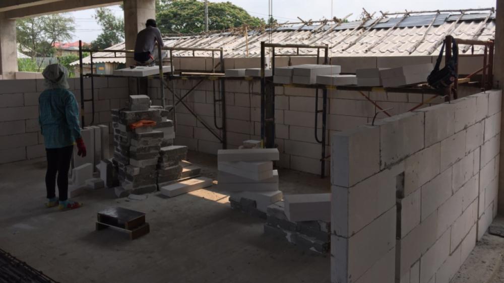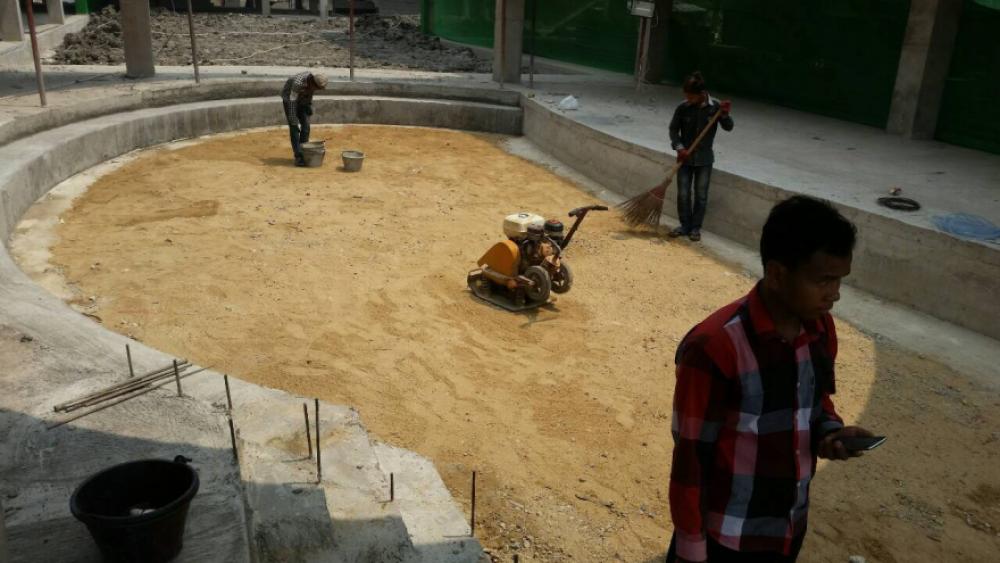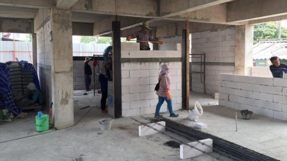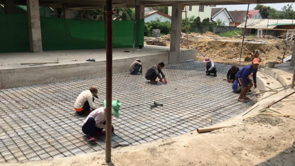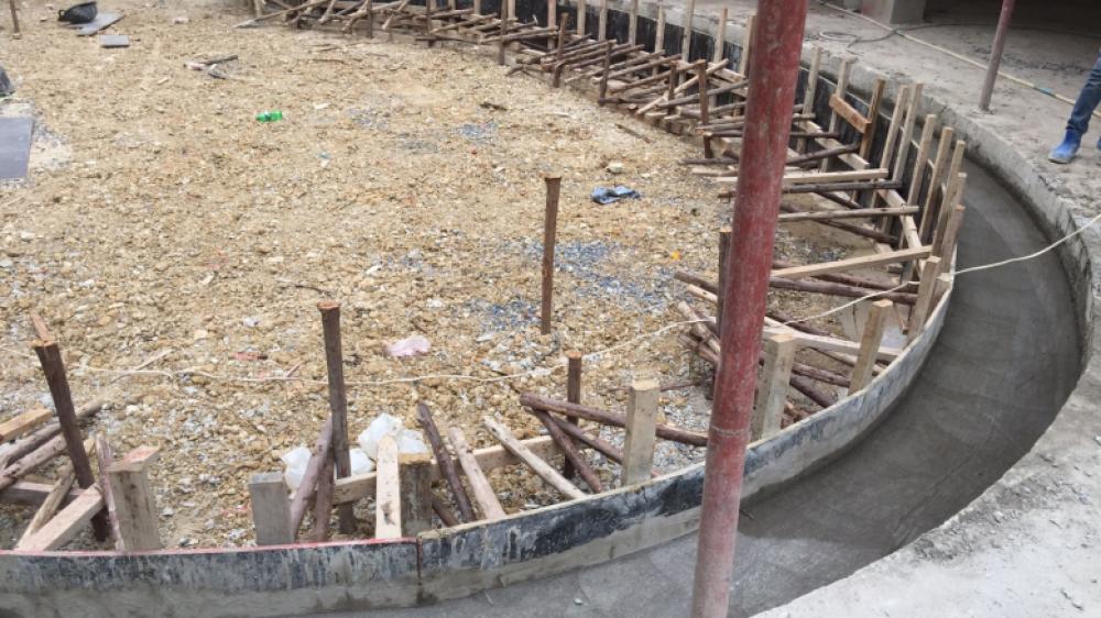 The structure of the school’s amphitheatre is close to completion. Steel tie work was prepared for the first step of the amphitheatre followed by concrete pouring. The floor of the amphitheatre was then leveled and steel tie work was installed for the ground. At the same time, there has been rapid progress to mason the lightweight concrete bricks in the northeast wing. These concrete walls will form part of the rooms in the northeast wing, such as the Parent Room, Visitor’s Room, Mechanical Room, and Nurse’s Room.